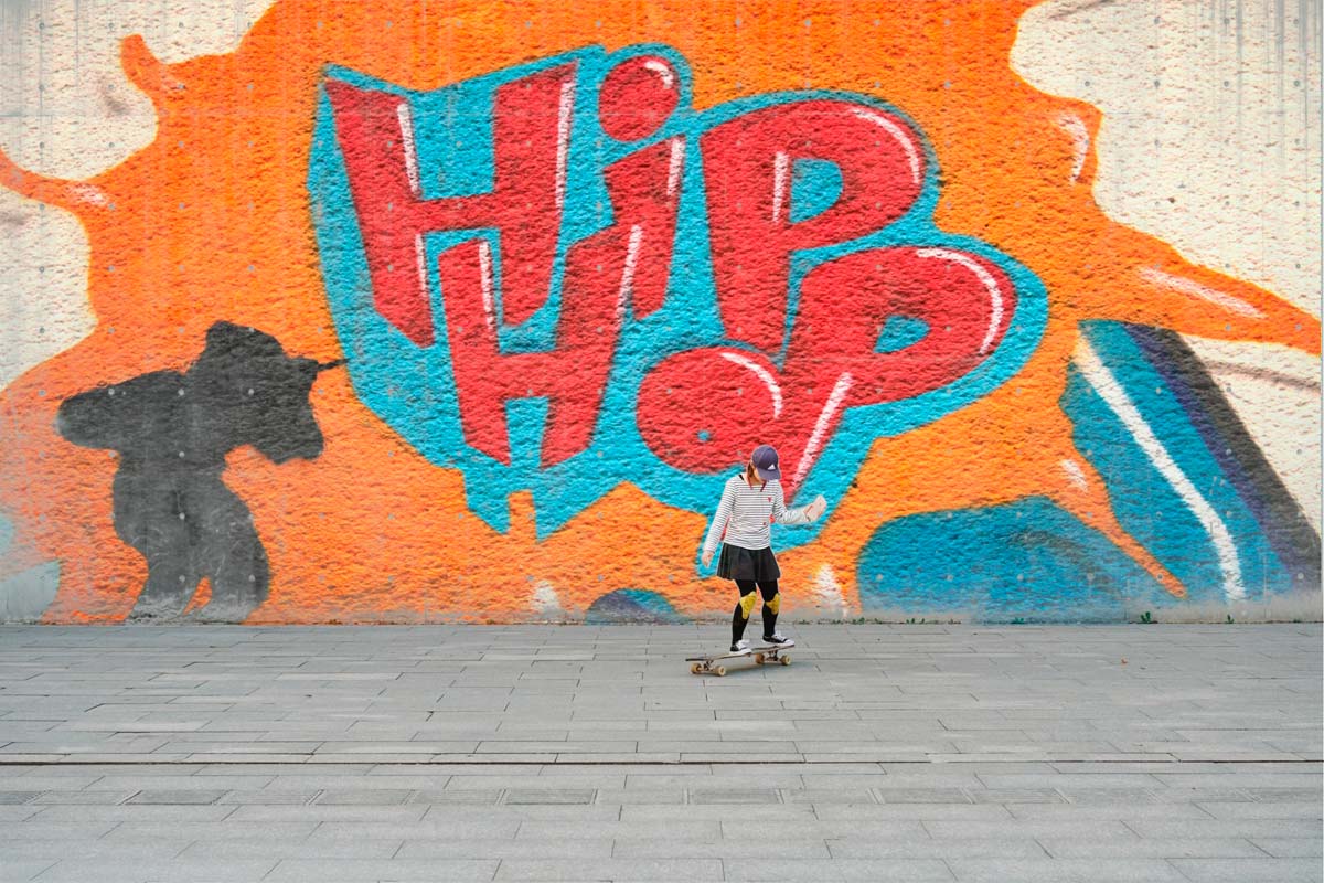 Ora il muro non è più di cemento grigio ma decorato con un graffito adatto all'immagine della ragazza con lo skateboard.